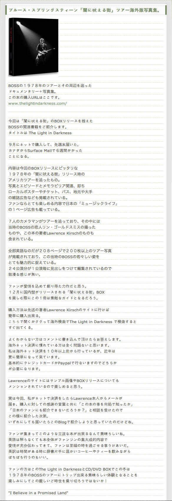 Lawrence; Just checked out the web site on the Light in Darkness. It looks brilliant and you have taken the art of letting those who love, appreciate and understand this very special artist and have been with him through the darkest times to a depth that has not been captured before. After Born to Run there were many who thought he could never to get to that special place again, and he did with lesser numbers on the journey then before, but those who were with him have and will be with him forever.